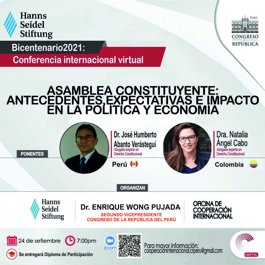Se parte de la conferencia internacional virtual que presentará alcances y proyecciones sobre el impacto de la asamblea constituyente en el Perú. En esta edición se tendrá un gran alcance en cuanto a los antecedentes y escenarios donde esta pueda afectar. Este evento es el resultado del trabajo conjunto entre la Segunda Vicepresidencia del Congreso de la República, la Oficina de Cooperación Internacional y la Organización Alemana Hanns Seidel Stiftung.