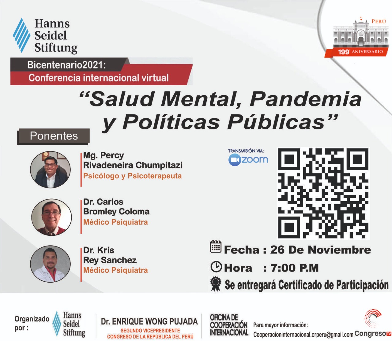 Se parte de la conferencia internacional virtual que presentara un análisis sobre la salud mental en la pandemia y su participación en las políticas públicas. En esta edición se tendría un alcance de las iniciativas para fortalecer la importancia de la salud mental como agentes social de cambio para revitalizar nuestra democracia. Este evento es el resultado del trabajo conjunto entre la Segunda Vicepresidencia del Congreso de la Republica, la Oficina de Cooperación Internacional y la Organización Alemana Hanns Seidel Stiftung.