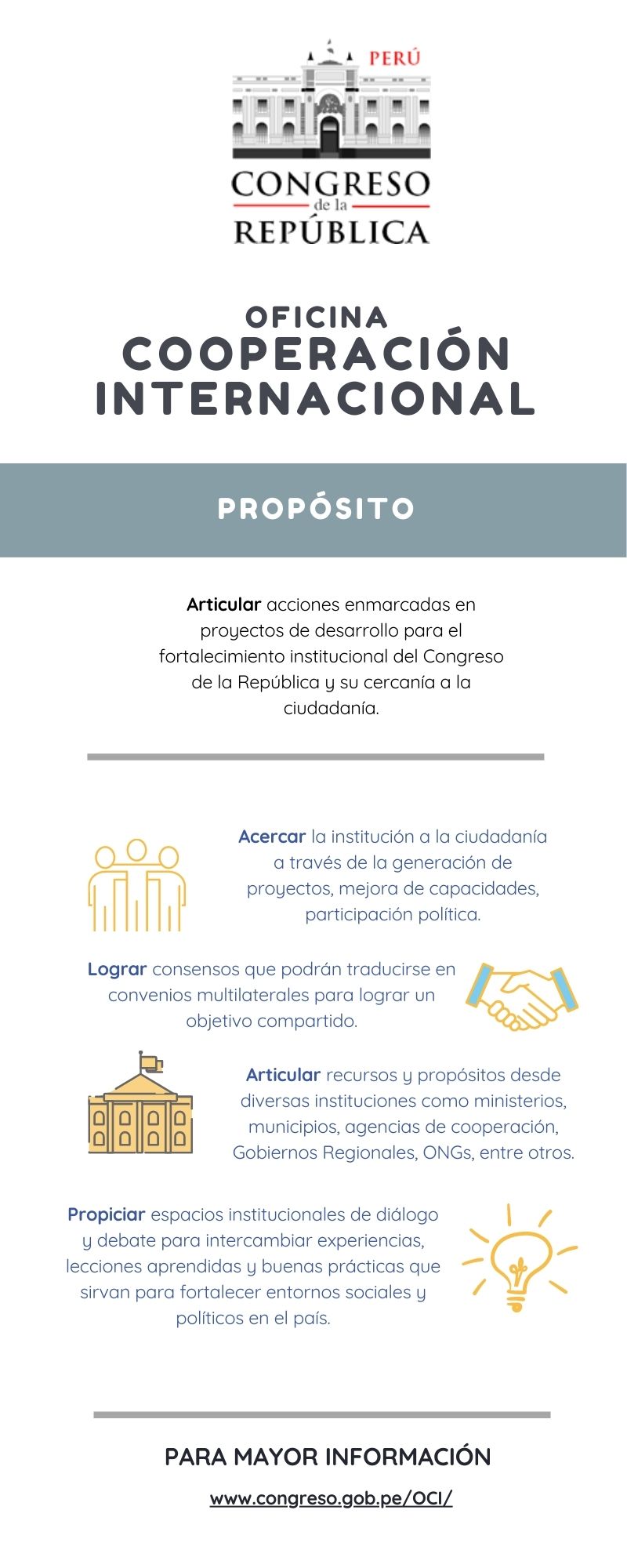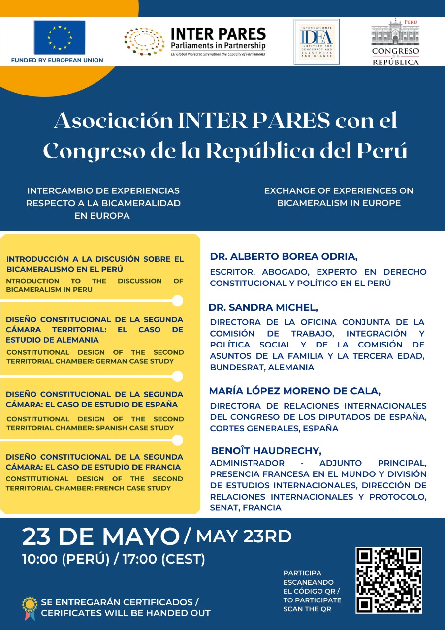 Te invitamos a participar en este evento internacional, "Intercambio de experiencias respecto a la Bicameralidad en Europa", organizado por el Segundo vicepresidente del congreso Enrique Wong Pujada, la oficina de cooperación Internacional, y la asociación Inter Pares con el Congreso de la República del Perú.