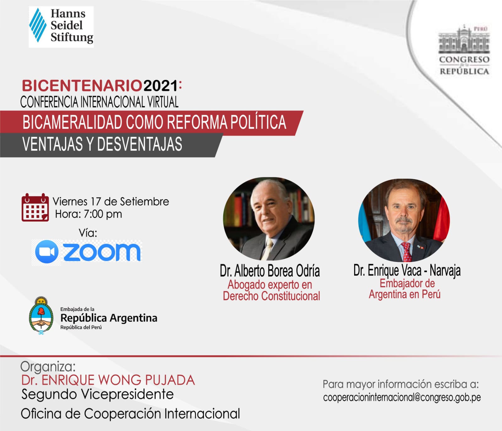 Se parte de la conferencia internacional virtual que presentará alcances y perspectivas legales e internacionales sobre la Bicameralidad. Se presentará casos reales que darán cuenta sobre la importancia que supone garantizar su aplicación. Este evento es el resultado del trabajo conjunto entre la Segunda Vicepresidencia del Congreso de la República, la Oficina de Cooperación Internacional y la organización alemana Hanns Seidel Stiftung.