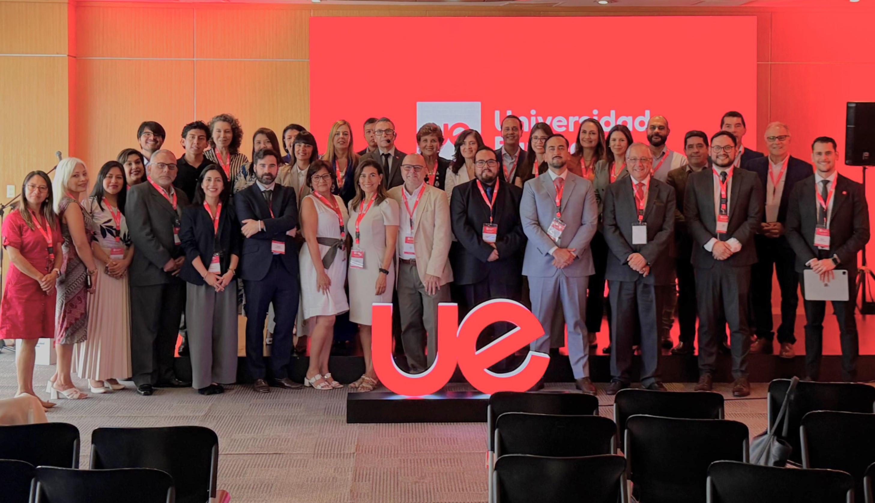 El equipo de la OCI en foto grupal con la CEO y presidenta de la UE (España y Portugal) Otilia de la Fuente, junto a los directivos de la UE y algunos líderes del sistema universitario peruano.