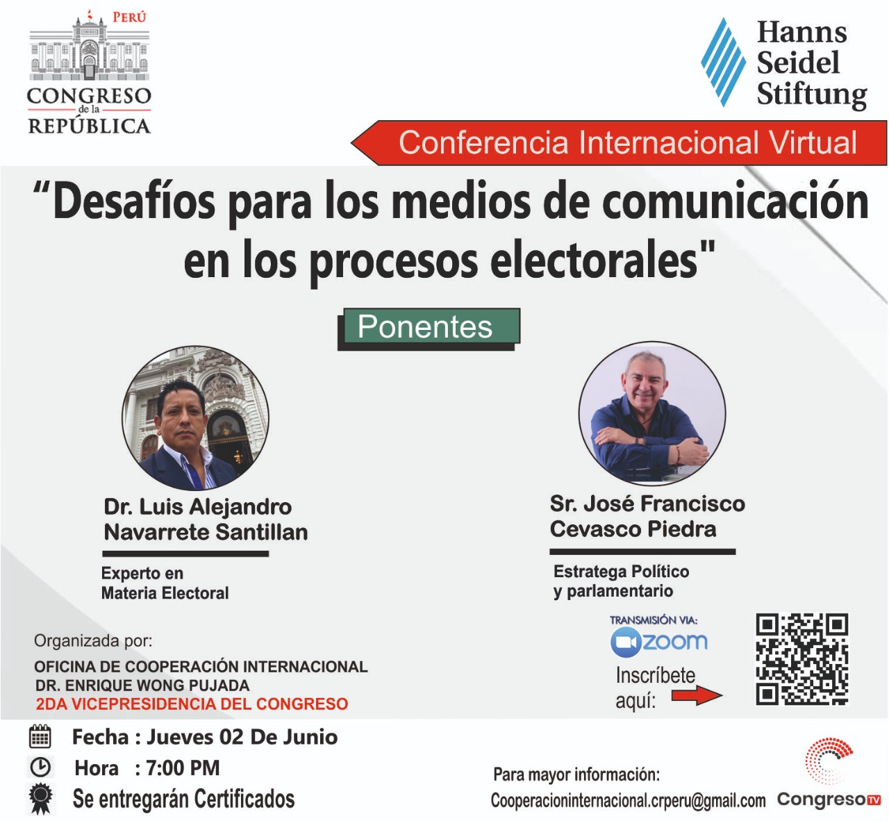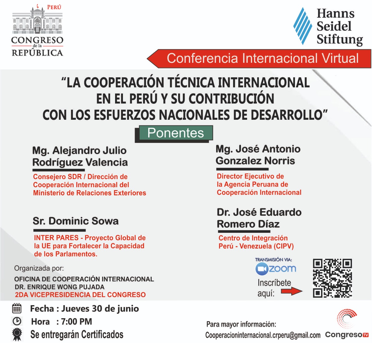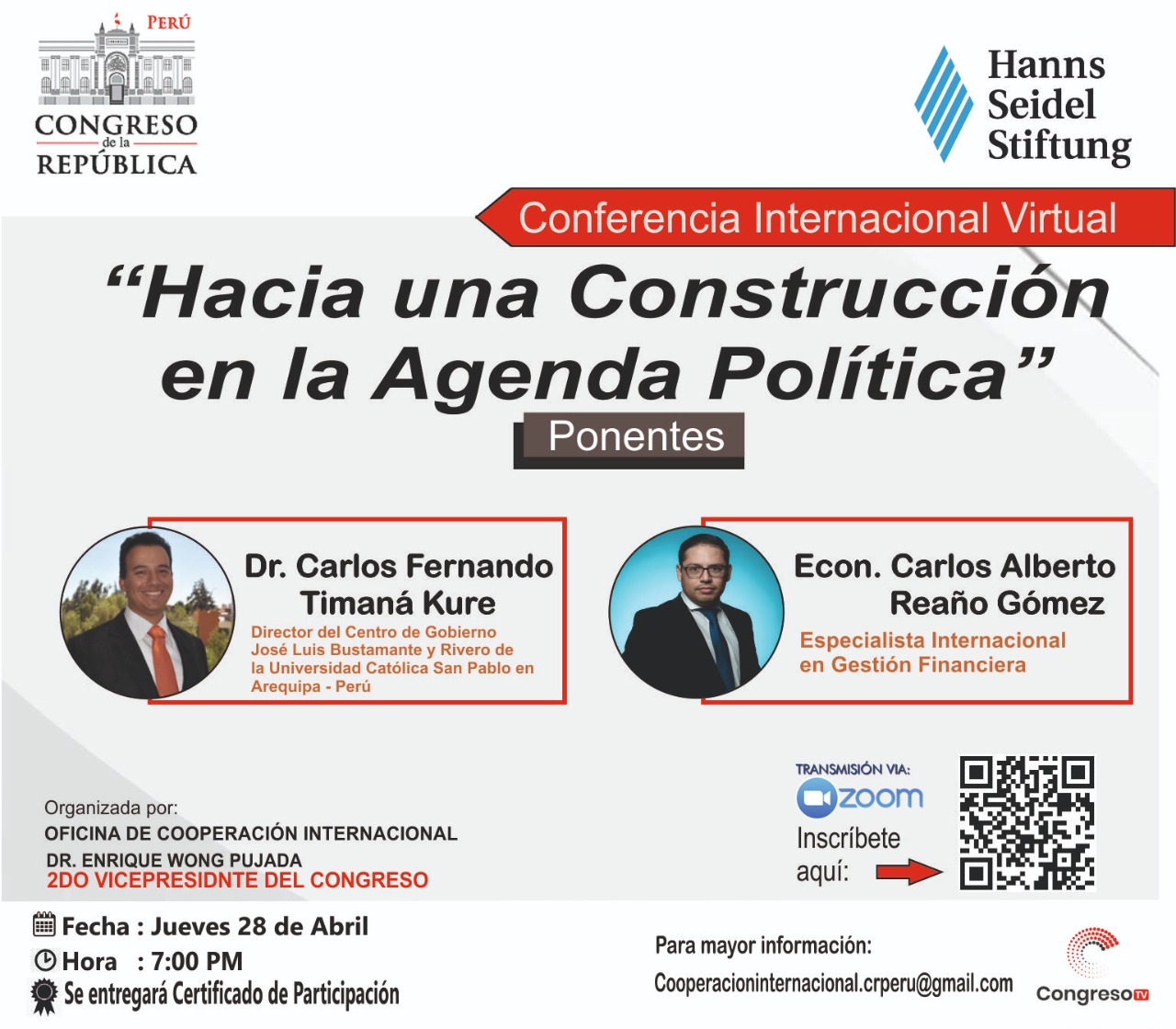 Este evento es el resultado del trabajo conjunto entre la Segunda Vicepresidencia del Congreso de la Republica, la Oficina de Cooperación Internacional y la Organización Alemana Hanns Seidel Stiftung.