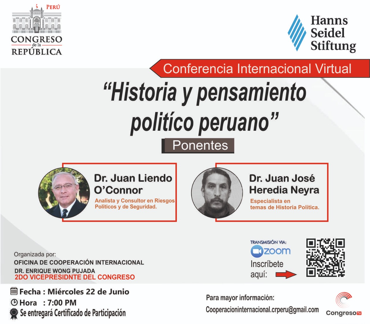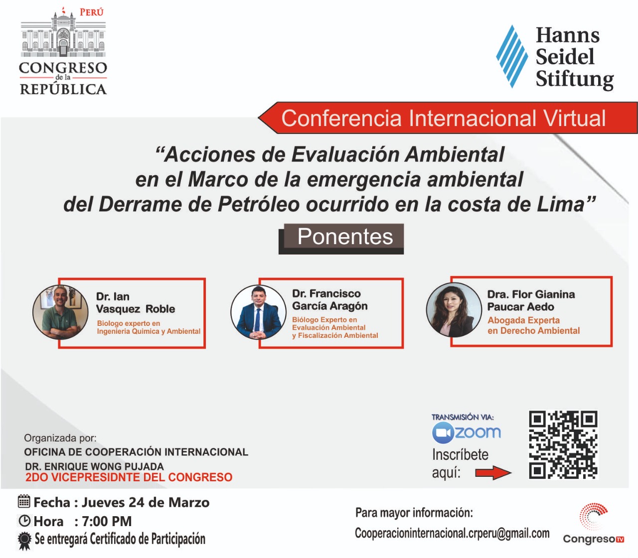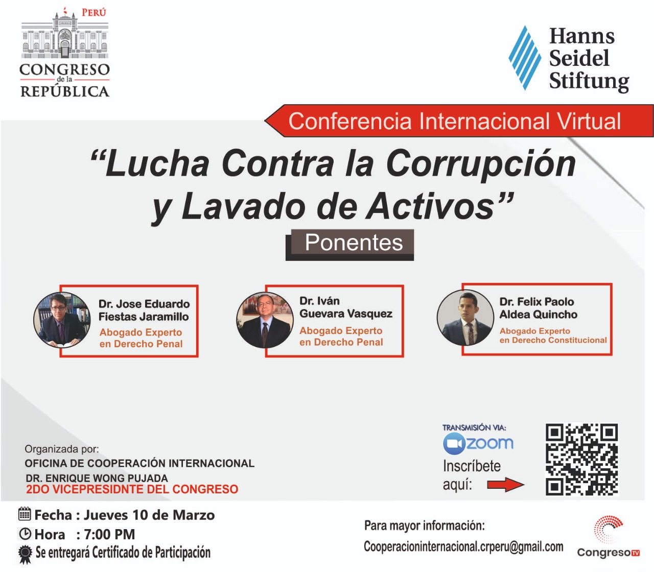 Se parte de la conferencia internacional virtual que presentara un análisis sobre la Lucha contra la corrupción y lavados de activos. En esta edición se tendría un alcance de las iniciativas para fortalecer la importancia de la ética e integridad de los políticos y servidores públicos. como agentes social de cambio para revitalizar nuestra democracia. Este evento es el resultado del trabajo conjunto entre la Segunda Vicepresidencia del Congreso de la Republica, la Oficina de Cooperación Internacional y la Organización Alemana Hanns Seidel Stiftung.