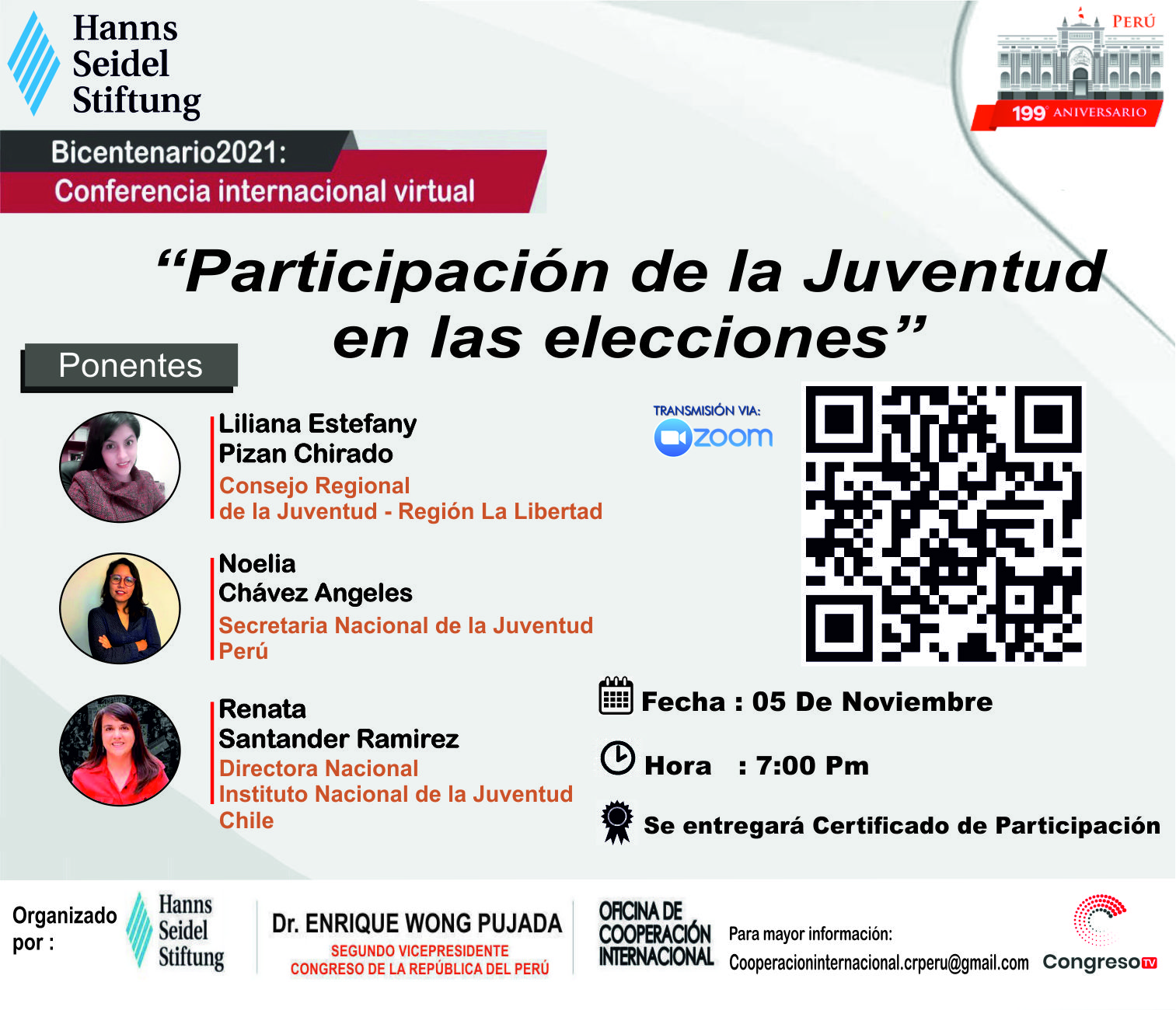 Se parte de la conferencia internacional virtual que presentará un análisis comparado sobre la participación política de la juventud en las elecciones. En esta edición se tendrá un alcance de las iniciativas para fortalecer la participación de los jóvenes en la vida política como agentes sociales de cambio para revitalizar nuestra democracia. Este evento es el resultado del trabajo conjunto entre la Segunda Vicepresidencia del Congreso de la República, la Oficina de Cooperación Internacional y la Organización Alemana Hanns Seidel Stiftung.