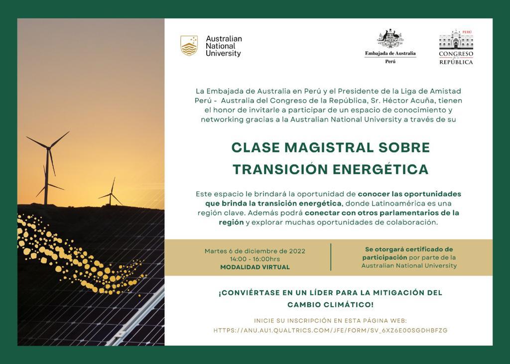 La Segunda Vicepresidencia del Congreso de la República y la Oficina de Cooperación Internacional informa e invita a los Congresistas de la Republica y asesores del congreso, a una charla relacionada al cambio climático, organizado por la Embajada de Australia en Perú y el Presidente de la Liga de Amistad Perú – Australia del Congreso de la Republica, que tiene como objetivo dar a conocer las oportunidades que brinda la transición energética en Latinoamérica. En este curso participarán parlamentarios de la región, será en inglés con traducción simultánea al español y será certificada por la universidad australiana.