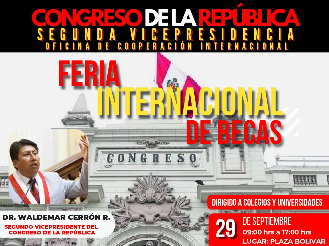 El Segundo Vicepresidente del Congreso de la República del Perú, Dr. Waldemar Cerrón Rojas, a través de la Oficina de Cooperación Internacional, hace la invitación a este importante foro donde se realizará el acercamiento de los estudiantes a los programas de becas internacionales, y así puedan tener una adecuada orientación para fortalecer sus conocimientos.