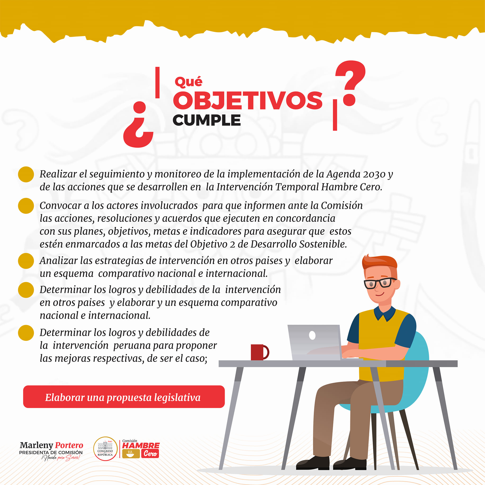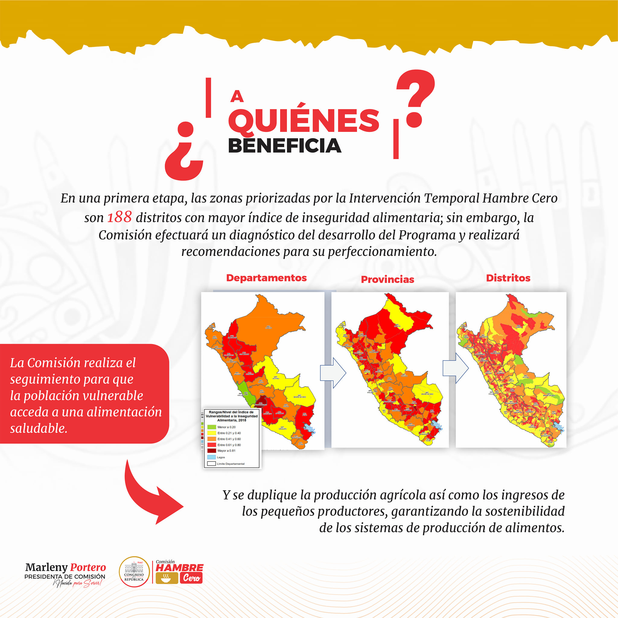 Quiero destacar que nuestro trabajo no se limita solo a la fiscalización, sino que también buscamos promover que el Poder Ejecutivo, a nivel estructural y organizacional, ponga fin al hambre y a todas las formas de malnutrición de manera focalizada, diferenciada en beneficio de la población vulnerable de la zona urbana y rural de nuestro país.