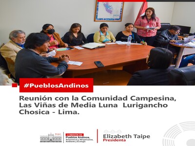 La comisión de Pueblos, presidida por la congresista Elizabeth Taipe, se reunió con la Comunidad Campesina, las Viñas de Media Luna Lurigancho, Chosica. Para atender su problemática en cuanto al tráfico de tierras, desde la comisión de Pueblos, haremos la fiscalización correspondiente y estaremos vigilantes de estas problemáticas de las comunidades.