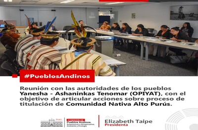 La Comisión de Pueblos Andinos, Amazónicos y Afroperuanos, presidida por la Congresista Elizabeth Taipe, la viceministra de interculturalidad, director de la DDC Pasco, representantes del MIDAGRI y autoridades de los Pueblos Yanesha - Ashaninkas Tenomar (OPIYAT), participaron en la reunión de coordinación para abordar la problemática de la comunidad nativa “Alto Purús”, del pueblo indígena Yanesha, con la finalidad de articular acciones sobre el proceso de titulación de la comunidad nativa Alto Purús (distrito Villa Rica) y superposición con títulos de predios otorgados por el Gobierno Regional de Pasco.