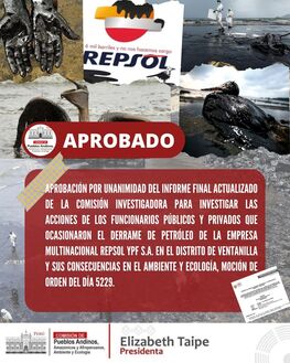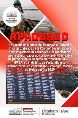 El Ex Presidente del Consejo de Ministros y presidente del Comité de Crisis instalado a raíz de derrame de petróleo, Dr. ANIBAL TORRES VASQUEZ, dio informe a la comisión investigadora de la Comisión de Pueblos Andinos Amazónicos, Afroperuanos, Ambiente y Ecología, con el fin de retomar y concluir la investigación sobre las acciones que ocasionaron el derrame de petróleo de la Empresa Multinacional Repsol YPF S.A. en Ventanilla y sus consecuencias en el medio ambiente y la ecología, el señor Aníbal Torres en su calidad de compareciente, informo sobre las acciones realizadas durante su gestión respecto del derrame de petróleo (crudo) en el terminal de Multiboyas N° 02 en Ventanilla el 15 de enero de 2022.