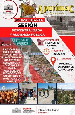 Desde la Comisión de Pueblos Andinos, Amazónicos y Afroperuanos, Ambiente y Ecología, hacemos extensiva la invitación a la décima cuarta sesión descentralizada y audiencia pública que se llevará a cabo el viernes 16 de junio, a las 10:00 am en la Comunidad Campesina de Pampamarca, Distrito de Cotaruse, Provincia Aymaraes, Region Apurimac.