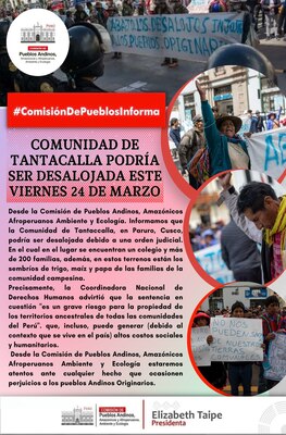 COMUNIDAD DE TANTACALLA PODRÍA SER DESALOJADA ESTE VIERNES 24 DE MARZO