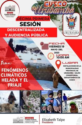 El viernes 19 de mayo del presente se llevó a cabo la DÉCIMA PRIMERA SESIÓN EXTRAORDINARIA DESCENTRALIZADA - V AUDIENCIA PÚBLICA – CUSCO, URUBAMBA de la Comisión de Pueblos Andinos, Amazónicos y Afroperuanos, Ambiente y Ecología, en la cual participaron autoridades locales, regionales y sectoriales de los diferentes entidades del ejecutivo (AGRORURAL, MIDIS, PRONIED, FONCODES, MINSA, Gobierno Regional de y Municipalidades distritales), con la finalidad de que informen sobre las acciones desarrolladas en el marco de la prevención y mitigación sobre la problemática de las heladas y friaje que año a año afrontan las comunidades alto andinas.