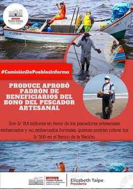 El ministro de la Producción, señor Raúl Pérez Reyes, informó que a través de la Resolución Ministerial N.º 0091-2023-PRODUCE, publicada con fecha 02 de febrero 2023 en el diario oficial El Peruano, se aprobó el padrón de beneficiarios del “bono del pescador artesanal”, que incluye a pescadores artesanales embarcados y no embarcados con permiso de pesca. Según se informa desde este ministerio “Esta subvención económica única y extraordinaria de S/ 500 está enmarcada en el plan “Punche Productivo”, el cual destinó S/ 18.8 millones en favor de los pescadores artesanales y tiene como objetivo contribuir con la reactivación económica de la actividad, considerando las afectaciones que han tenido en la economía familiar”.