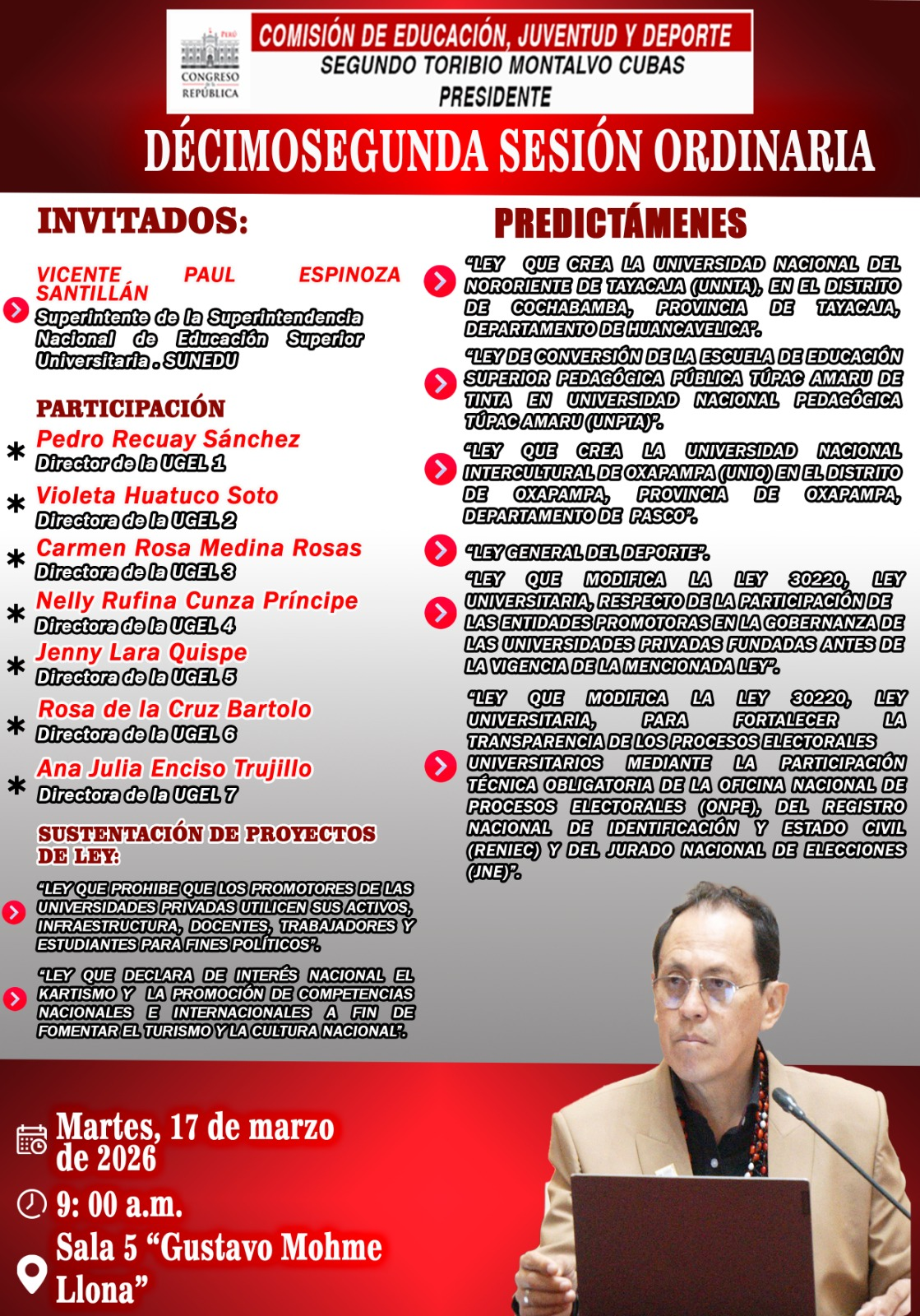 En cuanto a la función de representación, la Comisión organiza audiencias públicas descentralizadas, foros macroregionales y mesas de trabajo en las zonas más afectadas por el analfabetismo y las brechas educativas. Ello permite recoger las demandas de estudiantes, docentes, jóvenes, deportistas y autoridades locales para transformarlas en iniciativas legislativas prioritarias. La realidad educativa muestra que solo el 63,3 % de los estudiantes culmina la secundaria, que cerca del 40 % de los jóvenes entre 15 y 29 años no accede a la educación superior y que un 18 % de la juventud forma parte del grupo de los “ninis” (que no estudian ni trabajan).