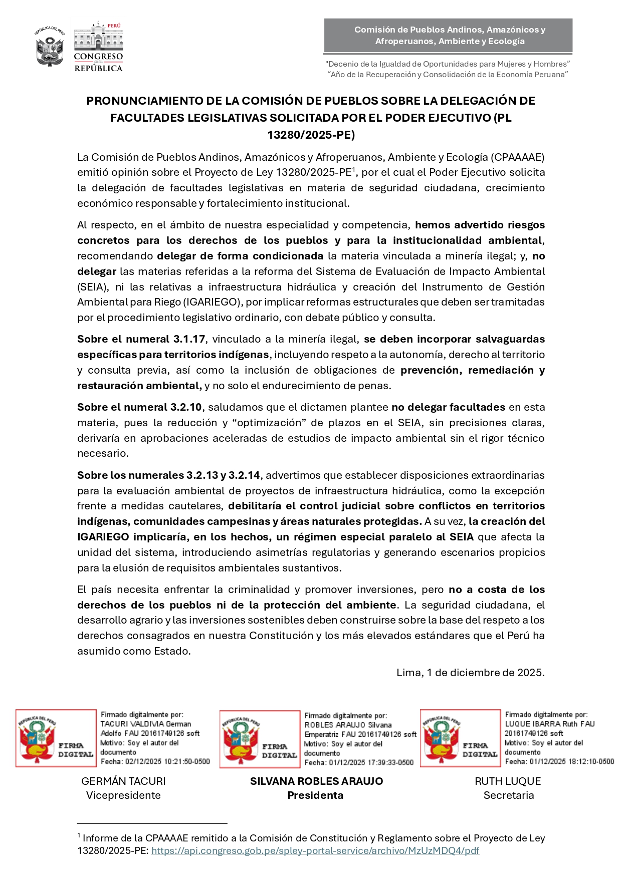 Comisión de Pueblos Andinos, Amazónicos y Afroperuanos, Ambiente y Ecología 2025-2026