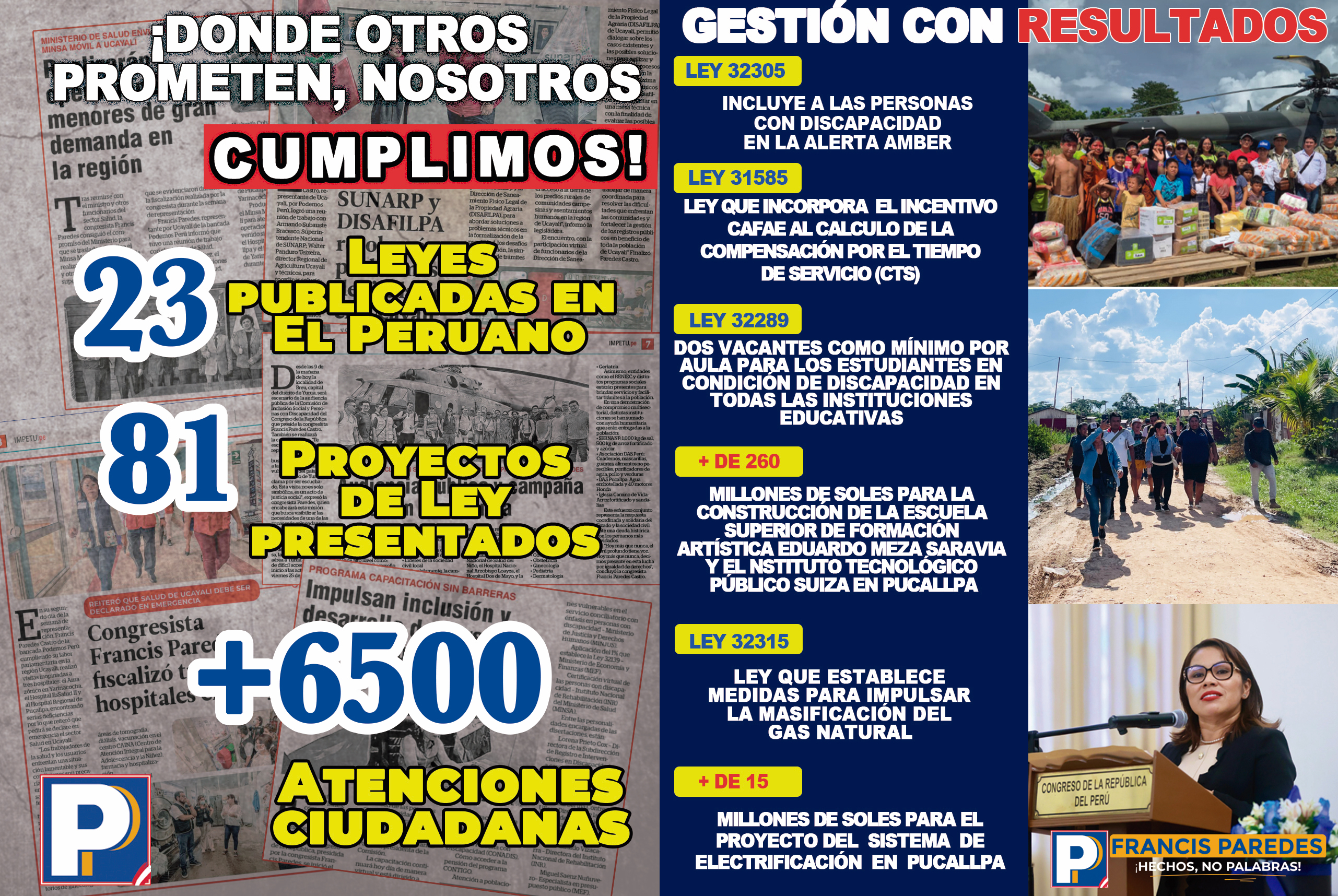 Francis Jhasmina Paredes Castro es una parlamentaria representante de la región amazónica de Ucayali, en Perú. Nació hace 41 años en el distrito de Callería, Provincia de Coronel Portillo, en un hogar humilde que se construyó gracias al esfuerzo de su familia. Desde chica tuvo pasión por la educación, por eso decidió ser maestra. Es profesora de Educación Secundaria egresada del Instituto Superior Pedagógico Bilingüe de Yarinacocha, bachiller en Educación por la Universidad Nacional Federico Villareal y máster en Administración de la Educación por la Universidad Privada César Vallejo. Ha sido maestra en distintas instituciones educativas públicas y privadas, y también ha asumido el cargo de directora. Su extensa experiencia en las aulas la llevó a asumir distintas responsabilidades como lideresa sindical, luchando principalmente contra las injusticias en las aulas de la Amazonía, región históricamente olvidada en el Perú. Actualmente integra las comisiones de Relaciones Internacionales; Vivienda, Construcción y Saneamiento; y Presupuesto y Cuenta General de la República en el Parlamento peruano como miembro titular, así como el Consejo Directivo y otras comisiones como accesitaria. Sus principales proyectos buscan el cierre de brechas en los sectores más vulnerables de Ucayali y del país. A la fecha tiene 6 proyectos aprobados por el Pleno del Congreso, así como casi 40 propuestas presentadas.