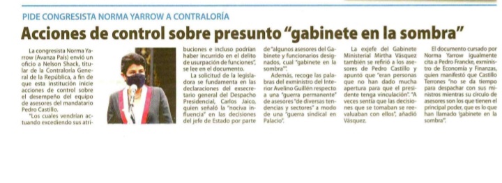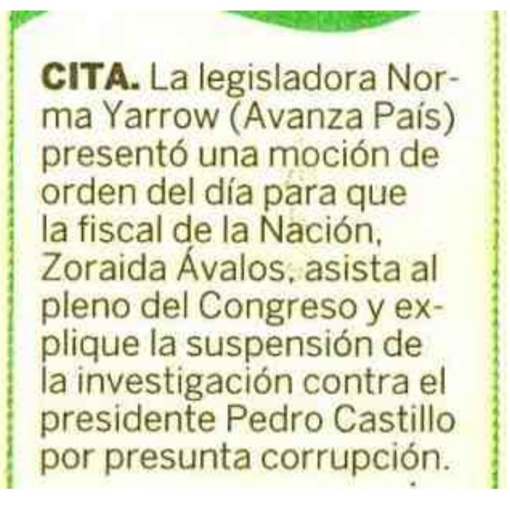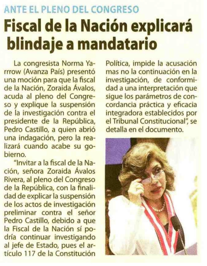 NORMA YARROW ANUNCIA QUE AVANZA PAÍS PRESENTARÁ UNA MOCIÓN DE VACANCIA CONTRA PEDRO CASTILLO