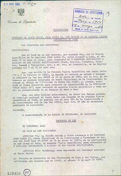Expediente del Proyecto de Ley N° 1756.Es presentado multipartidariamente el 9 de mayo de 1988, manifestando el homenaje al Santo Padre, con motivo de su segunda visita apostólica al Perú y declarando feriado no laborable las fechas de su estadía en nuestro país. En sesión de la Cámara de Diputados del 10 de mayo de 1988, es dispensado del trámite de comisión, quedando a la Orden del Día.