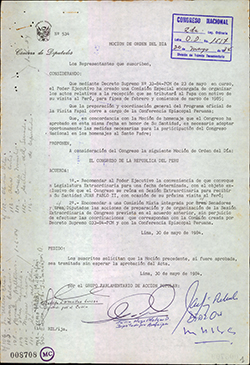 Moción de Orden del Día N° 1517.Presentado el 30 de mayo de 1984, por el Grupo Parlamentario Acción Popular y la Célula Parlamentaria Aprista, de la Cámara de Diputados, cuyo texto recomienda al Poder Ejecutivo la conveniencia de que convoque a Legislatura Extraordinaria, con el objeto exclusivo de que el Congreso se reúna en Sesión Extraordinaria para recibir a su Santidad.