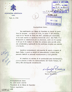 Carta fechada el 12 de mayo de 1988.Remitida por el sacerdote y diplomático italiano Luigi Dossena, Nuncio Apostólico en el Perú, al Presidente de la Cámara de Diputados Dr. Luis Alva Castro, agradeciendo la gentileza de enviarle copia de la Moción de Orden del Día, aprobada por unanimidad, y manifiesta que esa muestra de afecto y respeto al Santo Padre, no dejará de comunicársela.