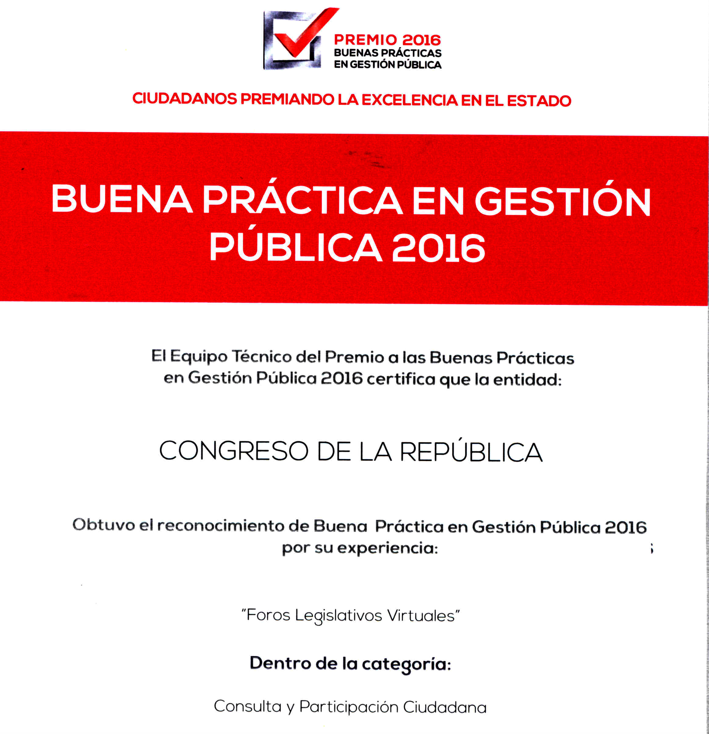 En la edición 2016 del concurso "Buenas Prácticas Gubernamentales" que promueve la ONG Ciudadanos al Día, el programa "Foros Legislativos Virtuales" del Congreso de la República del Perú obtuvo el reconocimiento del jurado calificador como "´Buena Práctica en Gestión Pública" y quedó como finalista en en la categoría "Consulta y Participación Ciudadana. Ver certificado / Ver resultados.