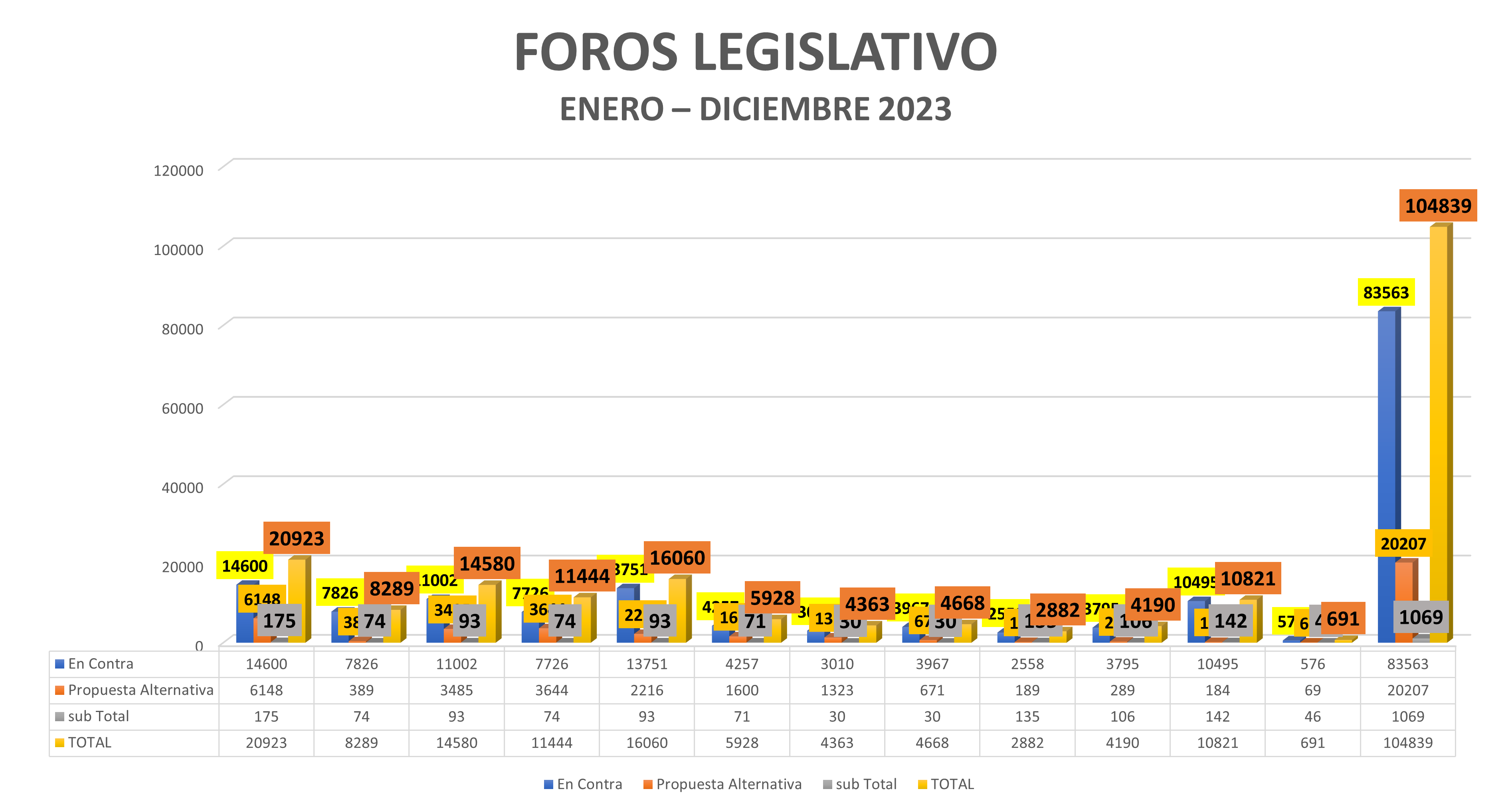 El cuadro estadístico que se muestra a continuación, presenta los foros y opiniones registrados por los ciudadanos sobre los proyectos de ley analizados en el Congreso de la República desagregado por la posición: "A favor", "En contra", "Propuesta alternativa", "Total de participantes", por mes y año. Los datos se actualizan inmediatamente se procesan las opiniones ciudadanas y se remiten a las instancias parlamentarias correspondientes en cumplimiento del Acuerdo del Consejo Directivo N° 9-2012-2013/CONSEJO-CR.