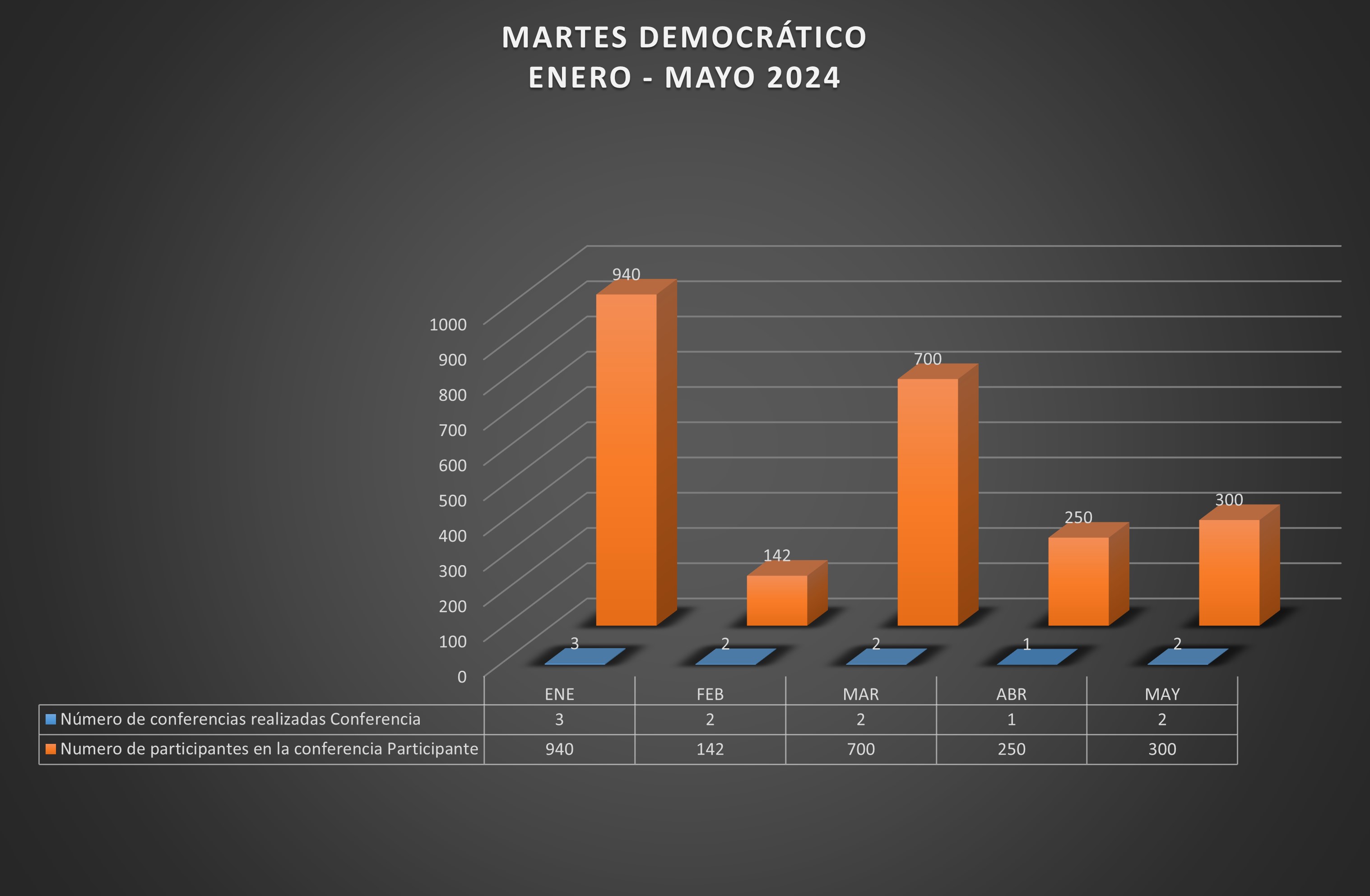 Registro de las actividades realizadas por el programa Martes Democrático, organizado por año, mes, número de evento, número de participantes y título de la conferencia; así como, el total de eventos y participantes por año calendario.
