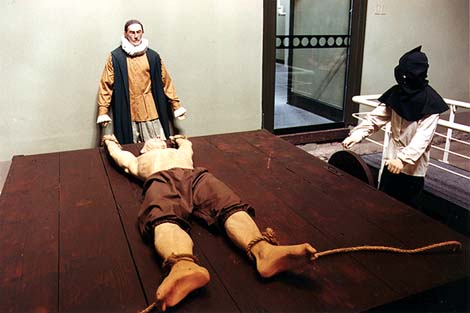 El potro: colocaban al preso sobre una mesa, amarrándole sus extremidades con sogas unidas a una rueda. Esta, al ser girada poco a poco, las iba estirando en sentido contrario, causando un terrible dolor.