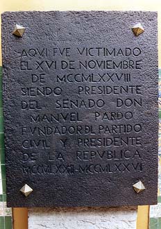 Placa recordatoria del asesinatode Manuel Pardo y Lavalle. Primer Presidente Civil del Perú (1872 - 1876) y Presidente del Senado. Tal suceso ocurrió el 16 de noviembre de 1878, cuando ingresaba al local. El sargento Melchor Montoya, que se encontraba en ese momento de guardia, le disparó por la espalda. El Presidente avanzó por el pasadizo y cayó mortalmente herido en este sitio. Es uno de los más importantes mártires de la democracia peruana.