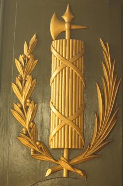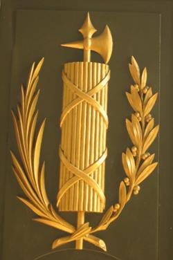 Puerta del Senado Nacional Las fasces eran una unión de 30 varas (una por cada curia de la antigua Roma) atadas de manera ritual con una cinta de cuero rojo formando un cilindro. Las varas unidas significan que "La unión hace la fuerza", puesto que es más fácil quebrar una vara sola que quebrar un haz de varas. El hacha simboliza la autoridad y el poder. La rama de palma simboliza la paz y la de laurel la victoria y la gloria.