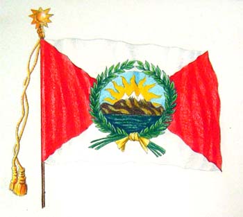 LA BANDERA NACIONAL Fue don José de San Martín, quien desde Pisco, en agosto de 1821, establece la primera bandera y el escudo en los siguientes términos: “Se adoptará por bandera nacional del país una de seda o lienzo, de ocho pies de largo y seis de ancho, dividida por líneas diagonales en cuatro campos, blancos los dos de los extremos superior e inferior, y encarnados los laterales, con una corona de laurel ovalada y dentro de ella un sol, saliendo por detrás de sierras escarpadas que se elevan sobre un mar tranquilo. El escudo puede ser pintado, o bordado, pero conservando cada objeto sus colores: a saber, la corona de laurel ha de ser verde y atada en la parte inferior con una cinta de color oro; azul la parte superior que representa el firmamento; amarillo el sol con sus rayos; las montañas de un color pardo oscuro, y el mar entre azul y verde.