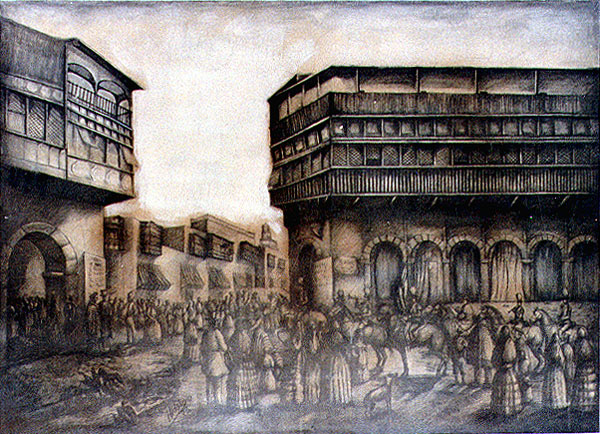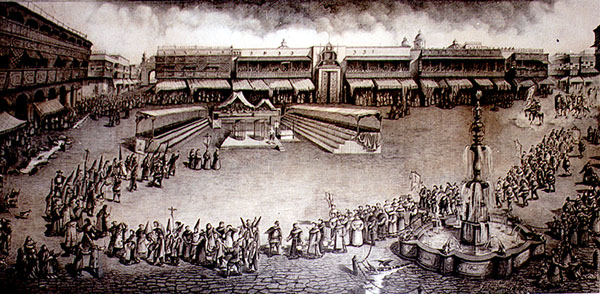 Cuadro del Pregon Este dibujo representa la realización de un auto de fe en la Plaza Mayor. Los autos de fe eran las ceremonias, cuidadosamente organizadas por el Tribunal, en que se leían su sentencias.. A primeras horas del día indicado para su realización, los reos eran sacados del local del Tribunal acompañados, cada uno de ellos, por dos padrinos. Se celebraba una misa, cuyo sermón estaba dirigido a tratar sobre las herejías, particularmente las cometidas por los enjuiciados. Seguidamente se procedía a la lectura de cada uno de los procesos y de las respectivas sentencias, para lo cual los reos eran colocados en jaulas. Con ello concluía el auto de fe, generalmente a altas horas de la noche.