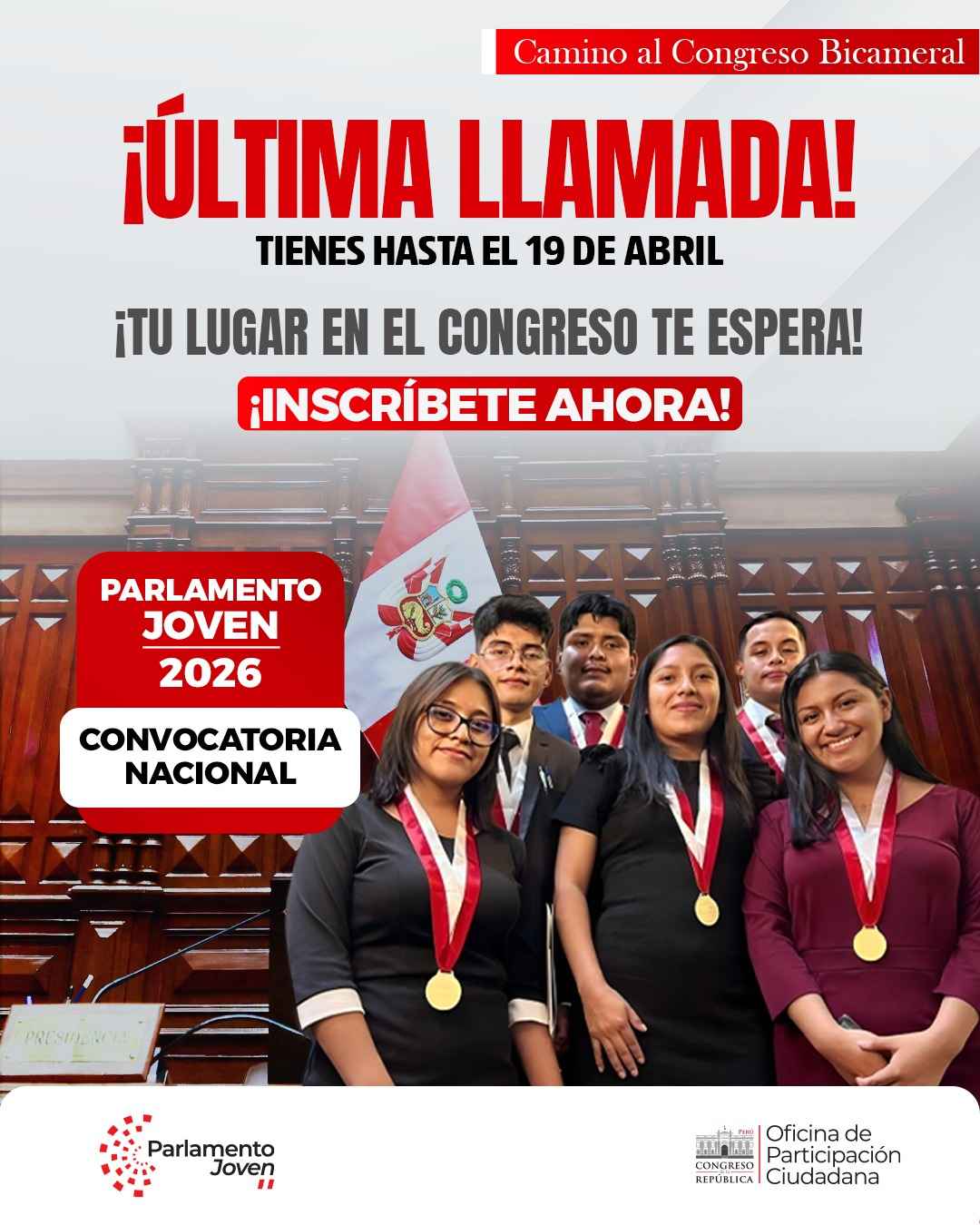 La Oficina de Participación Ciudadana abrió la convocatoria nacional 2026 del programa Parlamento Joven, dirigida a jóvenes de todas las regiones del país y del exterior interesados en participar activamente en la vida democrática y conocer de manera directa el funcionamiento del Congreso de la República, en el marco del proceso de implementación del sistema bicameral.