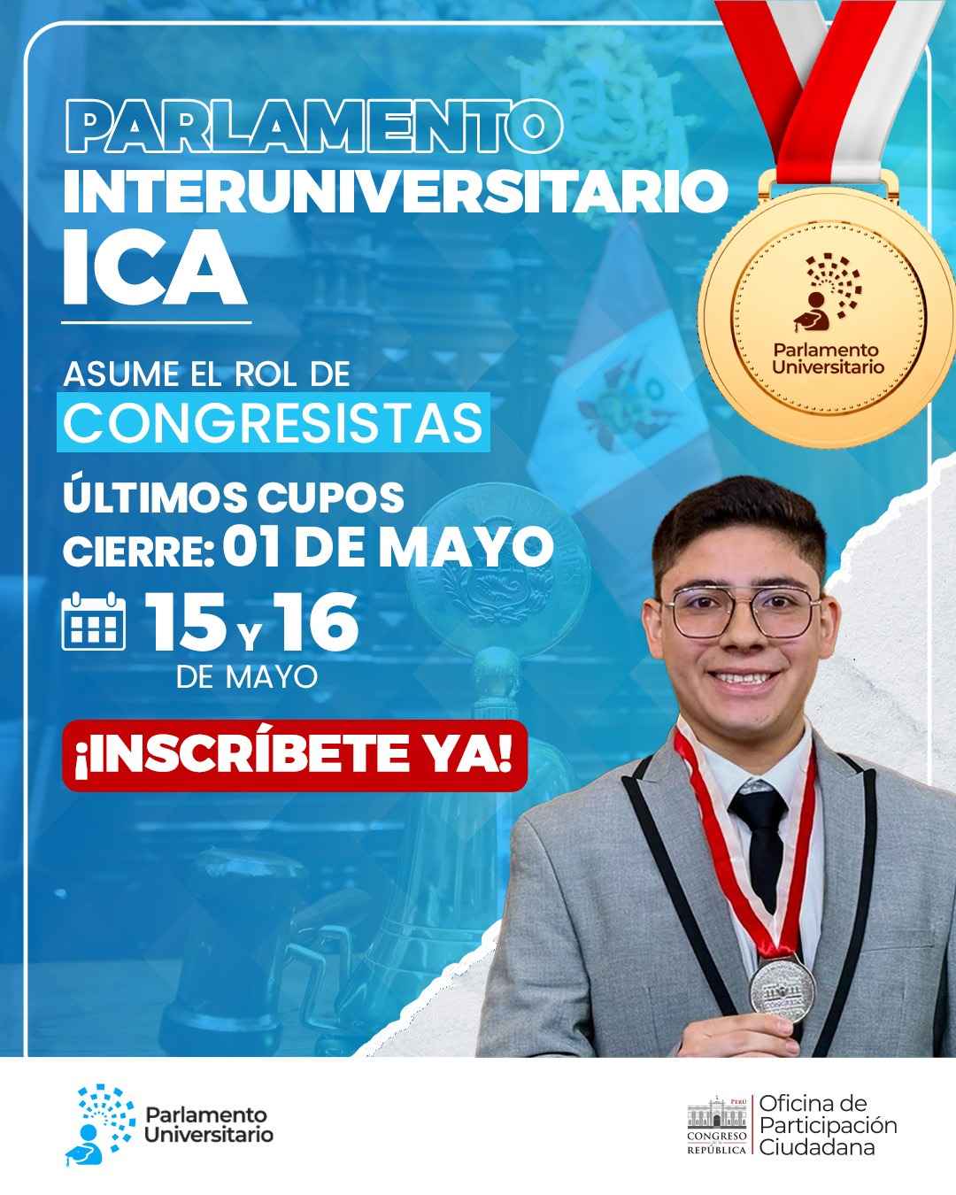 El Congreso de la República, a través de la Oficina de Participación Ciudadana, te invita a participar en el Primer Plenario Regional Interuniversitario Ica 2026, en el marco del programa Parlamento Universitario y el camino hacia el Congreso bicameral.