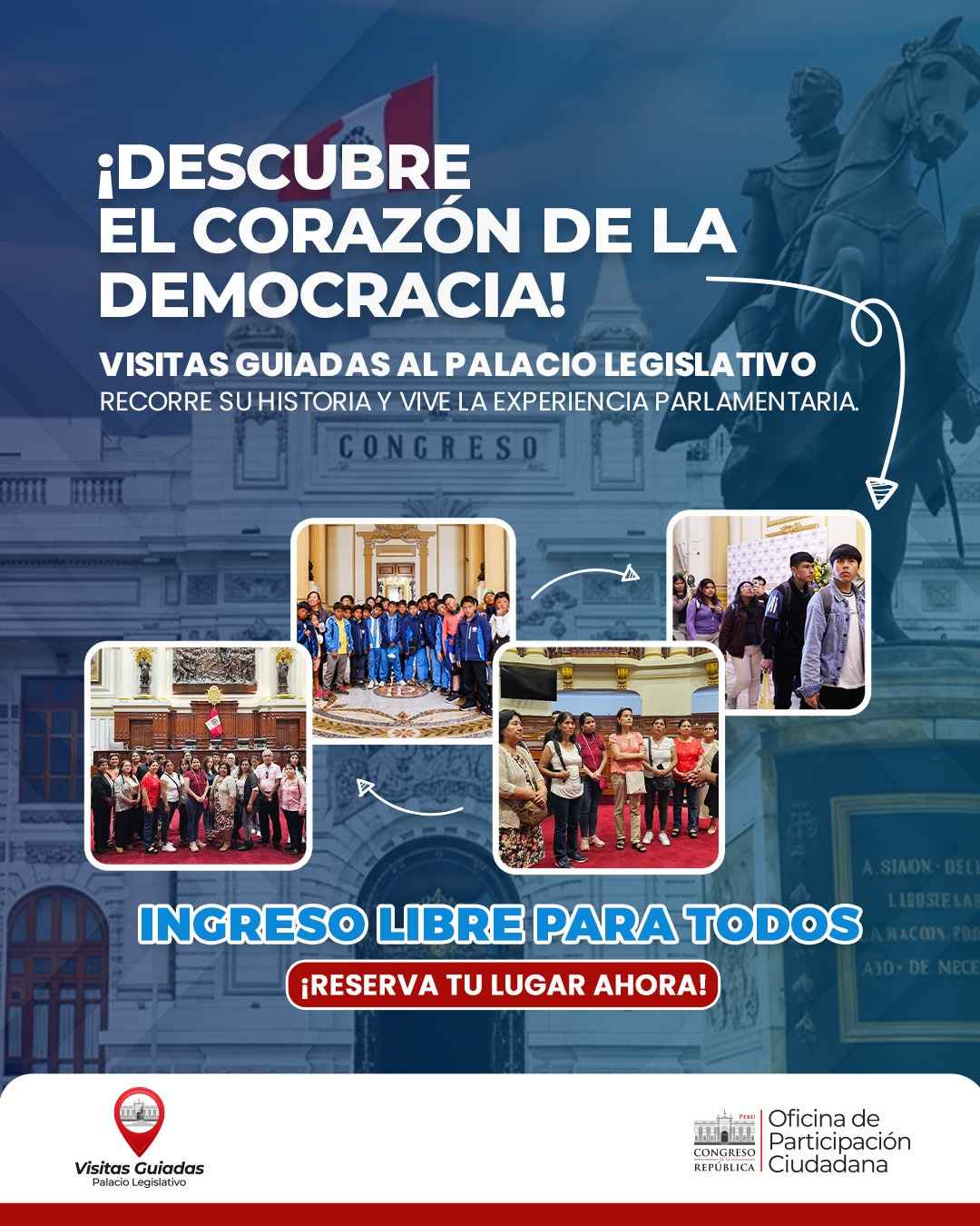La Oficina de Participación Ciudadana del Congreso de la República te invita a conocer el Palacio Legislativo y descubrir su historia, arquitectura y el rol que cumple en la democracia peruana. A través del programa de Visitas Guiadas, podrás recorrer los espacios más representativos del Parlamento y comprender cómo se desarrolla la labor legislativa.